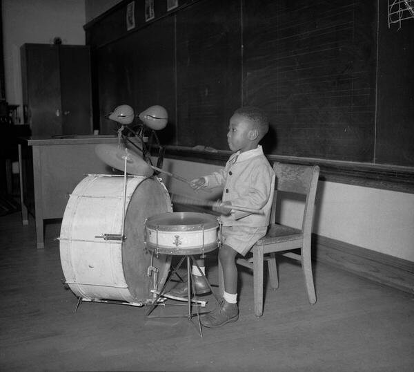 YOUNG ROGER HUMPHRIES PLAYING CHILD-SIZE DRUMS IN MUSIC CLASSROOM, CA. 1942